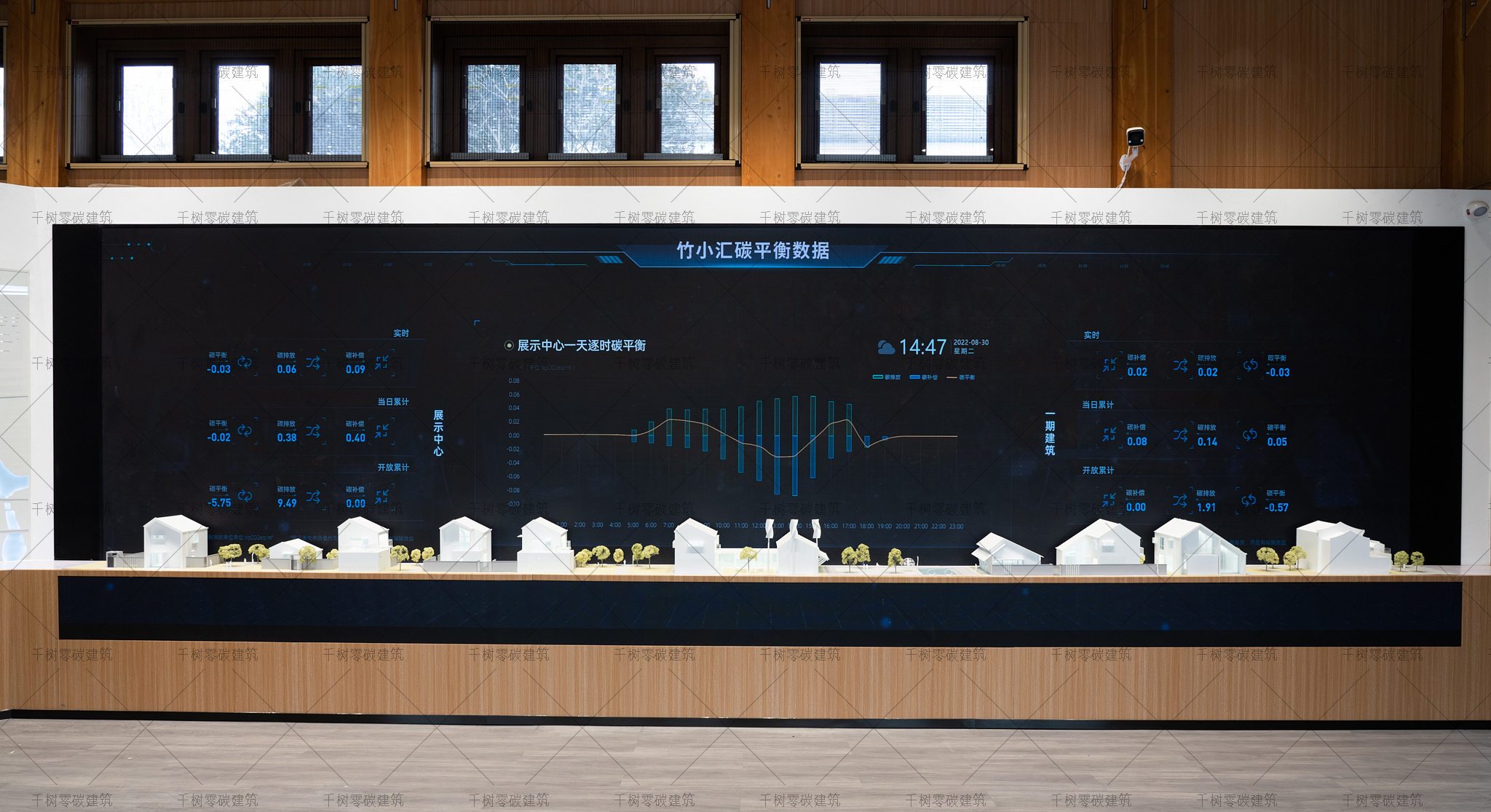 报告厅木屋和展示中心木屋墙面采用隔气膜+内外双层保温(内保温184mm厚,外保温70mm厚)+CLT正交胶合木饰面板,屋面采用隔气膜+保温(屋面保温235mm厚)+光伏瓦的围护结构,门窗采用被动式节能阻燃木门窗(内置遮阳百叶),加上高能效的技术设备:地源热泵系统、风力发电系统、建筑光伏一体化系统、光储直柔系统、热回收系统,通过可视化的智慧运维管理平台高效监管、智慧运算,综合管控与整治,最终实现了零碳建筑的目标。